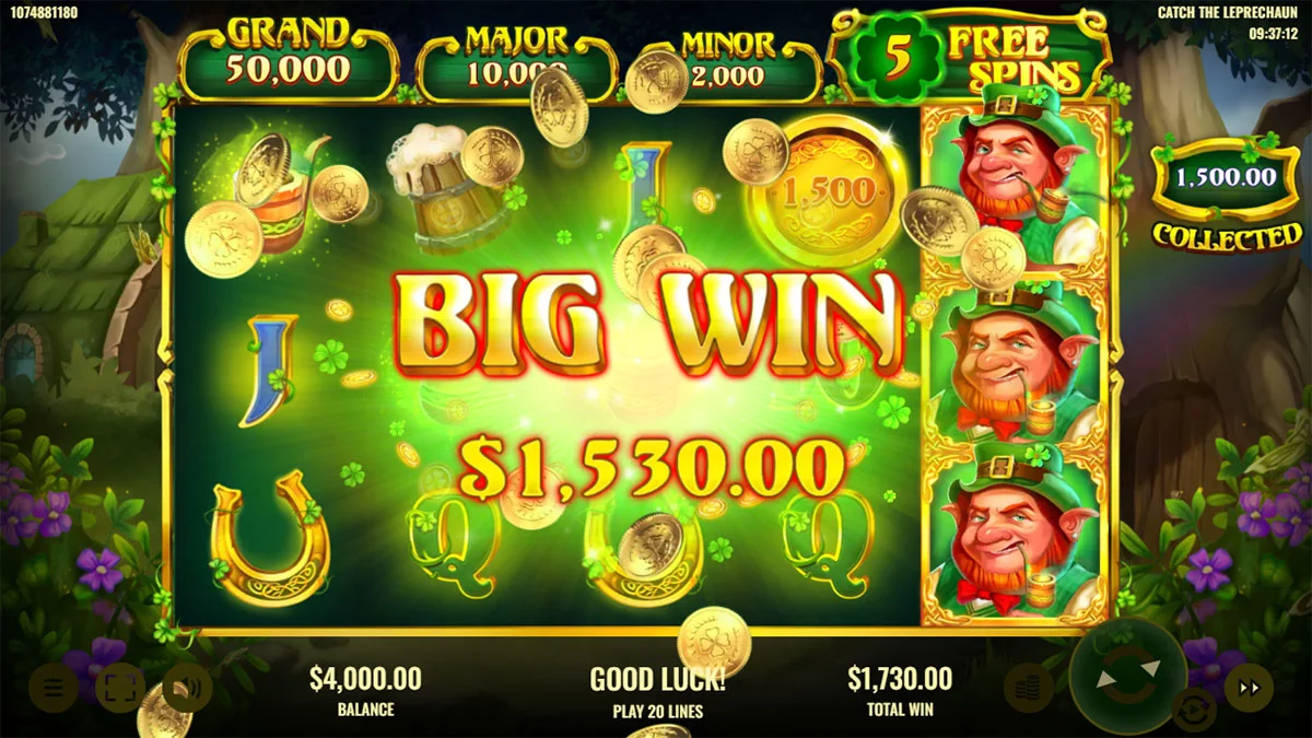 Fitur Catch the Leprechaun hendak dipicu kala Kamu menjatuhkan paling tidak 1 simbol dengan hadiah duit/ jackpot di mana saja pada gulungan 1- 4 serta simbol pengumpul pada baris yang sama di gulungan kelima per putaran. Kamu setelah itu hendak diberikan hadiah duit/ jackpot yang ditunjukkan. Nilai hadiah duit berkisar dari x20 sampai x150 dari taruhan Kamu per garis, sebaliknya nilai jackpot berkisar dari x200 sampai x5000 dari taruhan Kamu per garis.